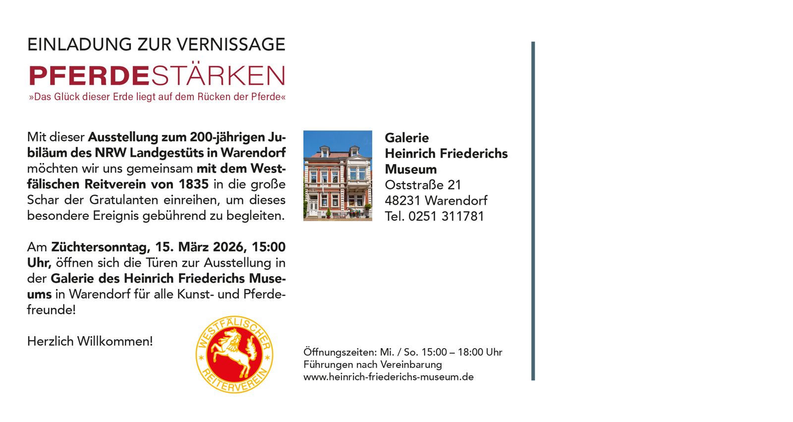 Zum 200jährigen Jubiläum des NRW-Landgestüts und im Jahr des "FEURIGEN PFERDES" möchten wir mit dieser Ausstellung diesen besonderen Anlass gebührend begleiten und feiern!